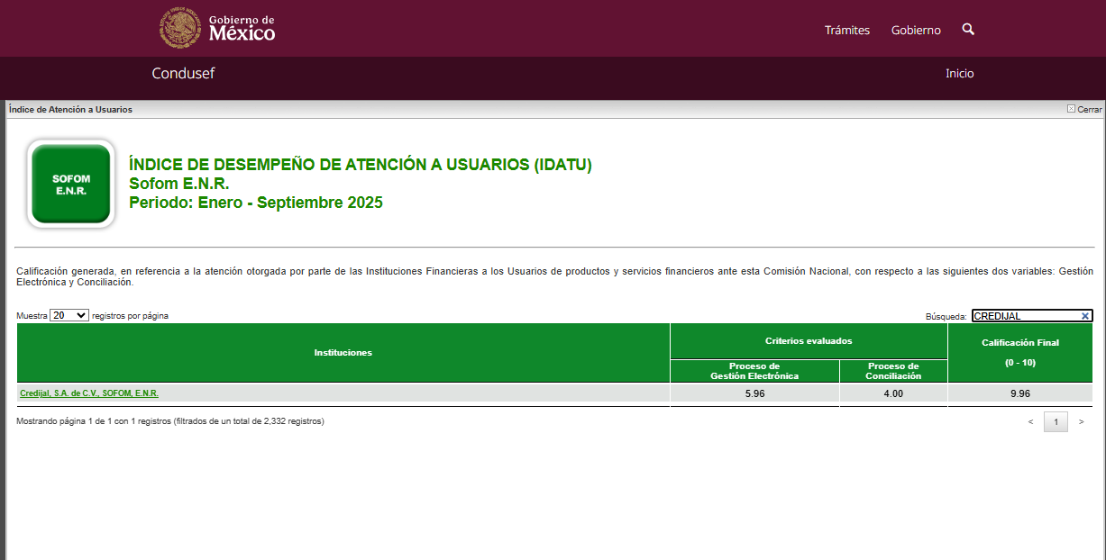 La información que se presenta a continuación corresponde únicamente a la información publicada en el Buró de Entidades Financieras de CONDUSEF sobre Credijal, S.A. de C.V., SOFOM, E.N.R., para conocer la información de todo el sector puede acceder al sitio www.buro.gob.mx.