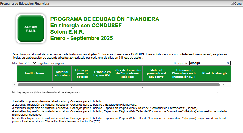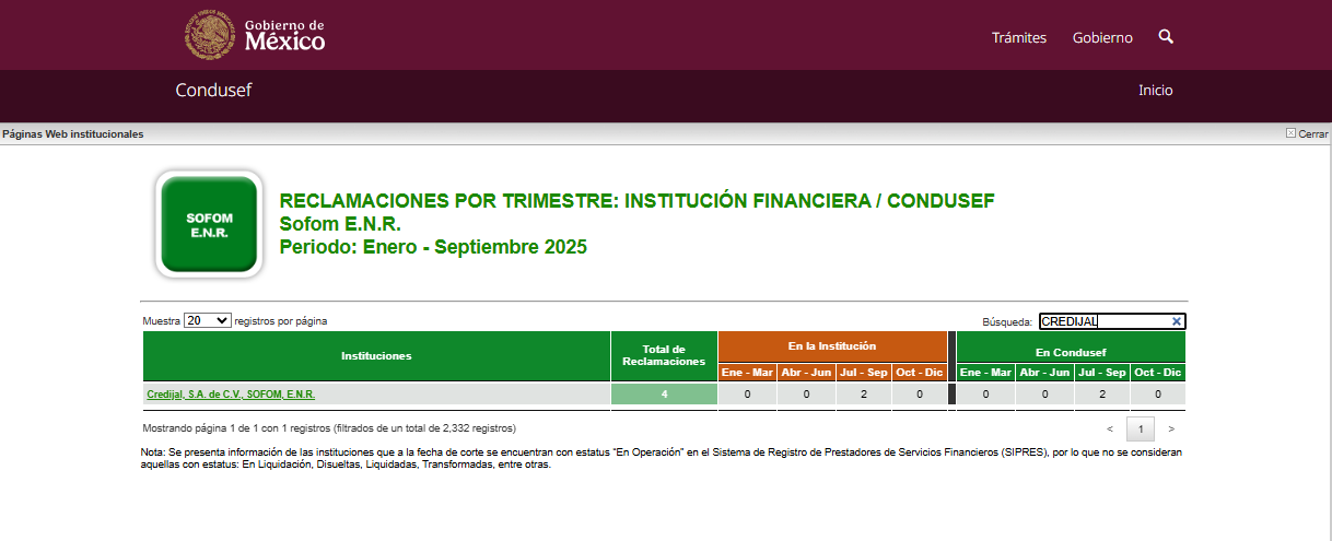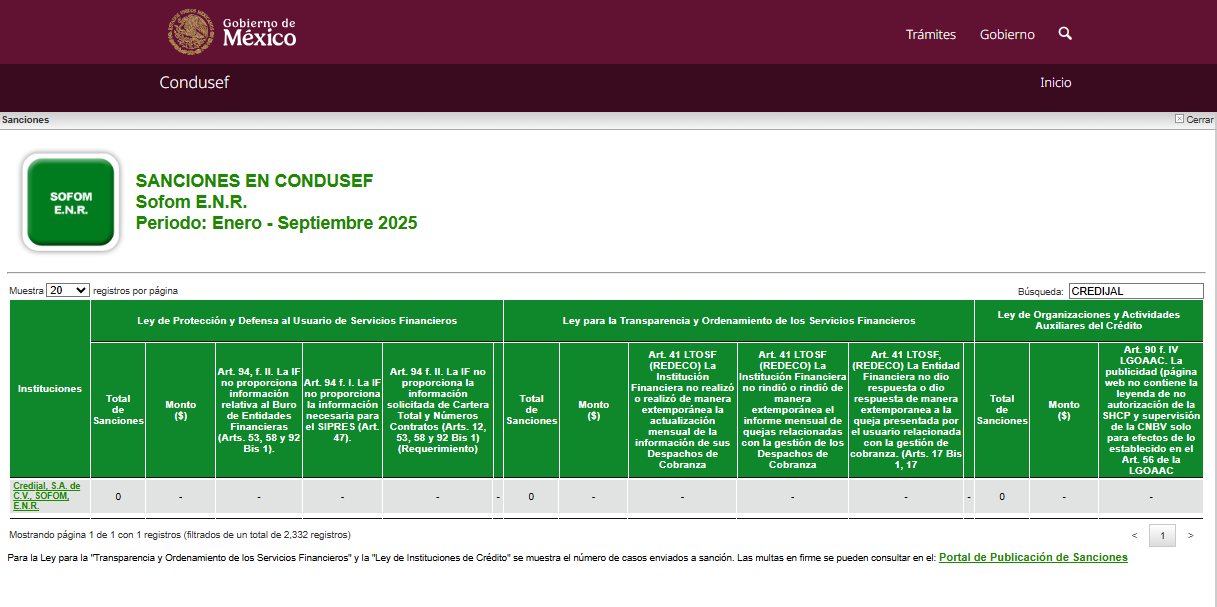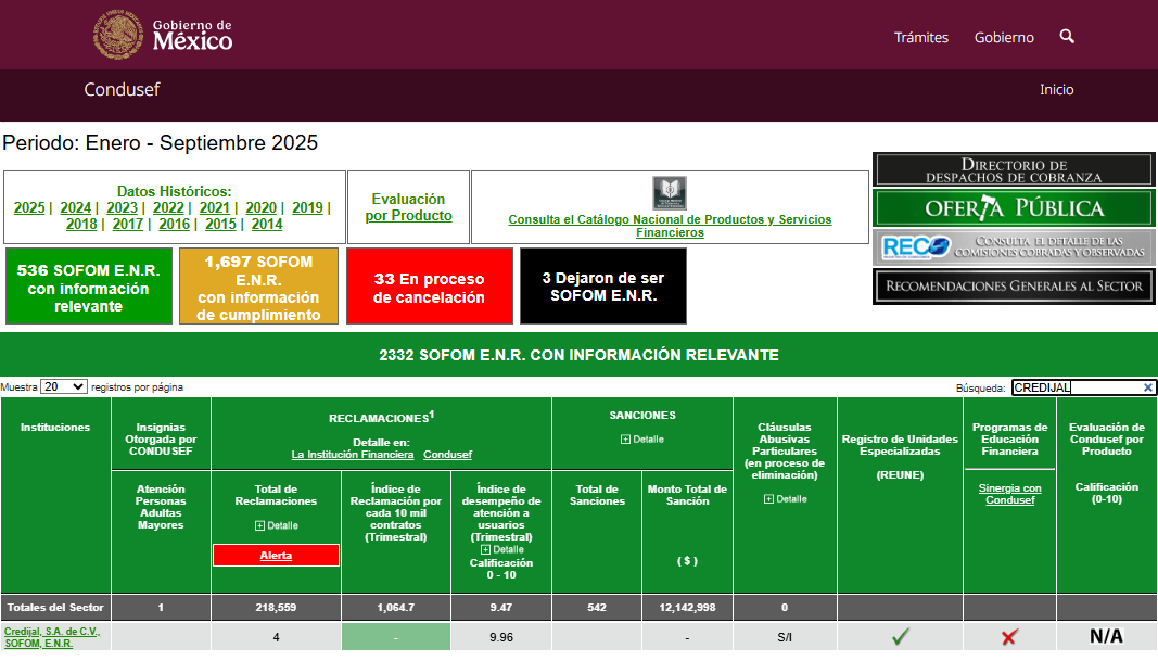 La información que se presenta a continuación corresponde únicamente a la información publicada en el Buró de Entidades Financieras de CONDUSEF sobre Credijal, S.A. de C.V., SOFOM, E.N.R., para conocer la información de todo el sector puede acceder al sitio www.buro.gob.mx.
